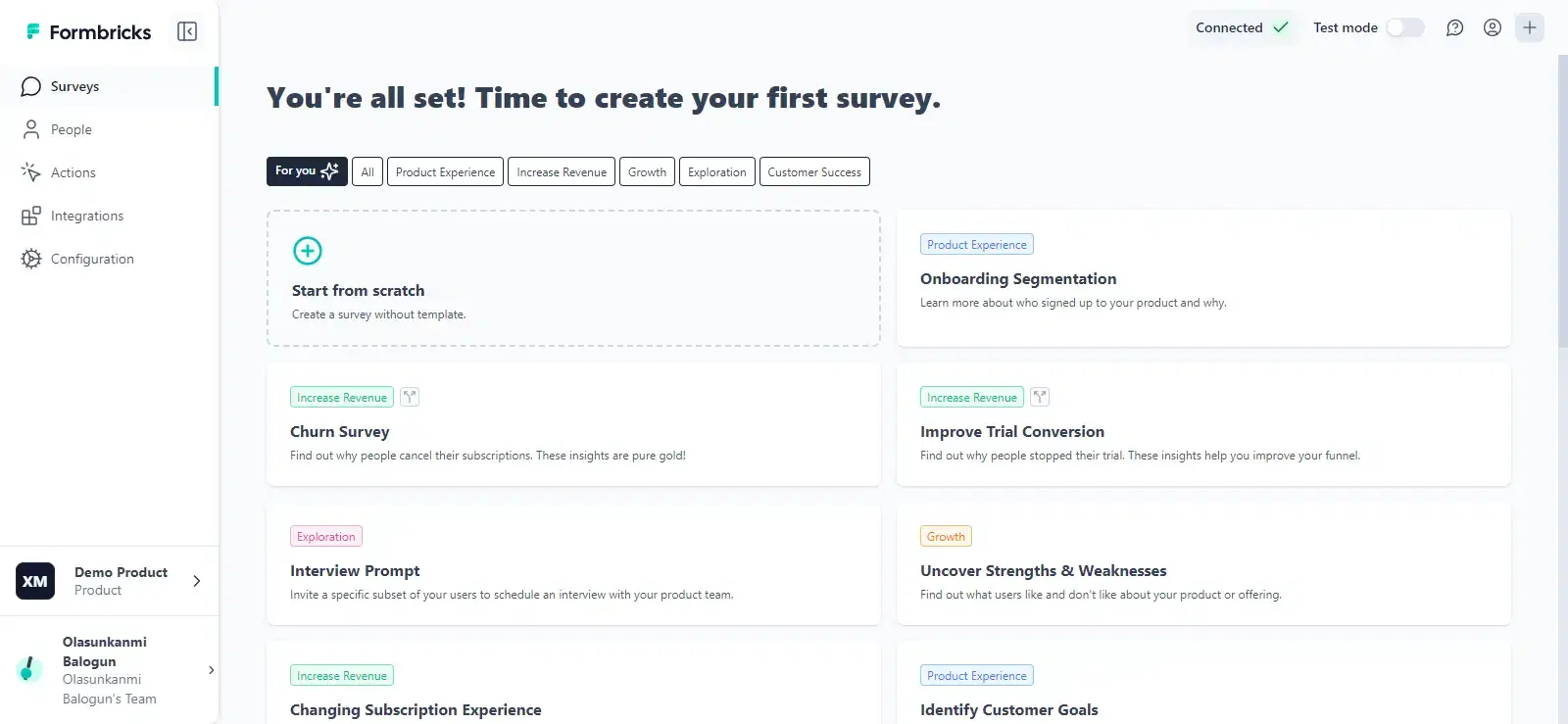 Formbricks is straightforward to get started with. After signing up, pick a ready-made template that suits your needs from its dashboard and get going straight away. No fuss, no muss.